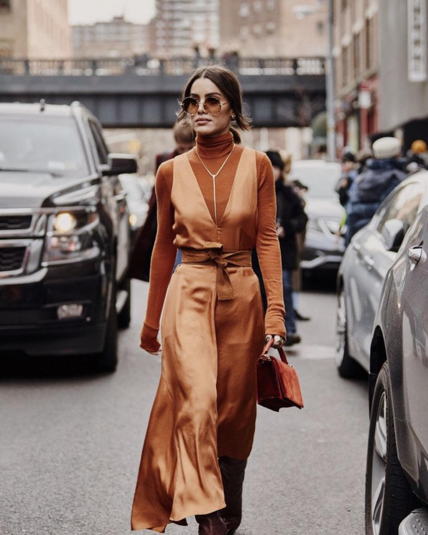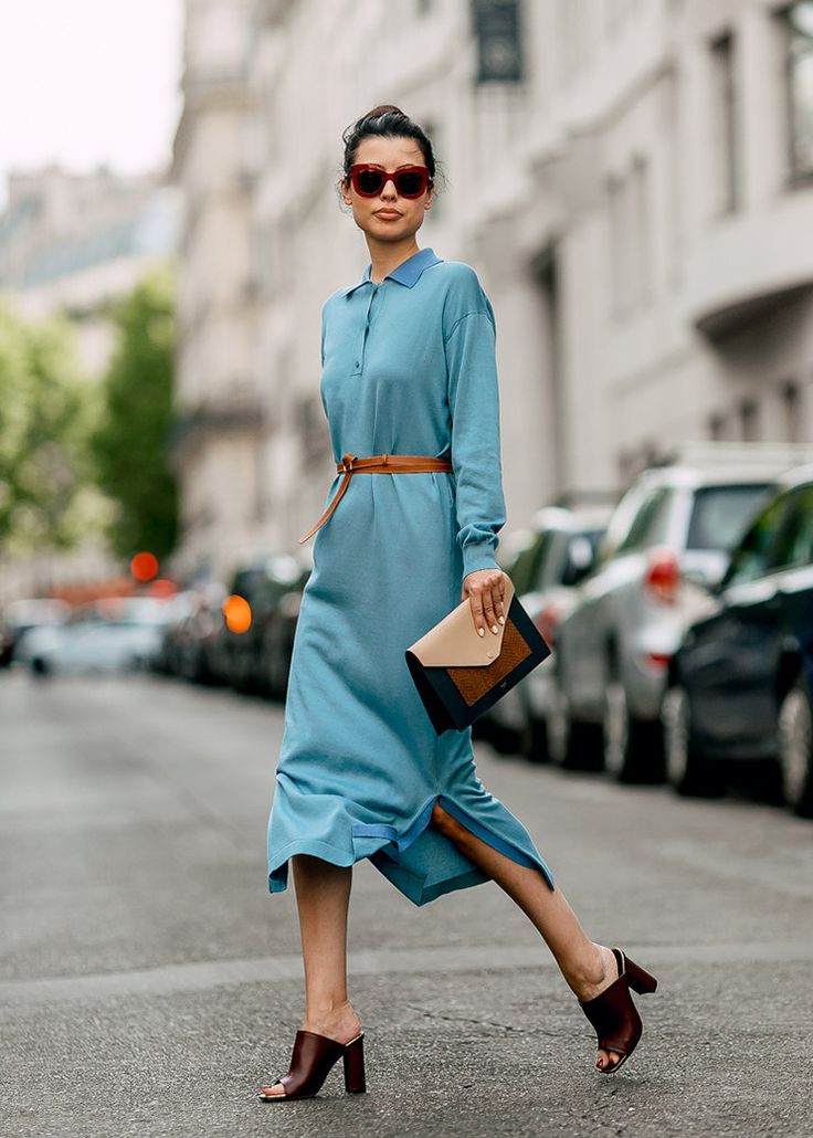 Ключевыми отличительными чертами этого летящего платья А-силуэта из мягкого материала стали: расширенный книзу подол, длинный рукав или три четверти, длина миди. В нынешнем сезоне эта модель легла в основу всевозможных деловых луков.