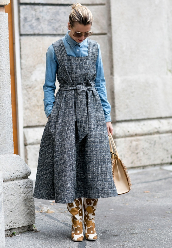 Сарафан подразумевает наличие второго изделия, которое нужно надеть под него. По обыкновению, это водолазка, рубашка или блуза. Осенью и зимой модные кутюрье предлагают интересные модели из шерсти и твида в комбинации с контрастирующими вещами.
